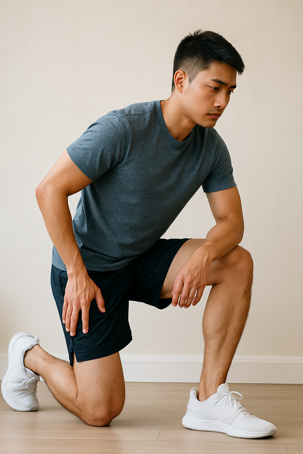- 로우 런지 자세로 고관절 스트레칭 및 전체 체형 안정